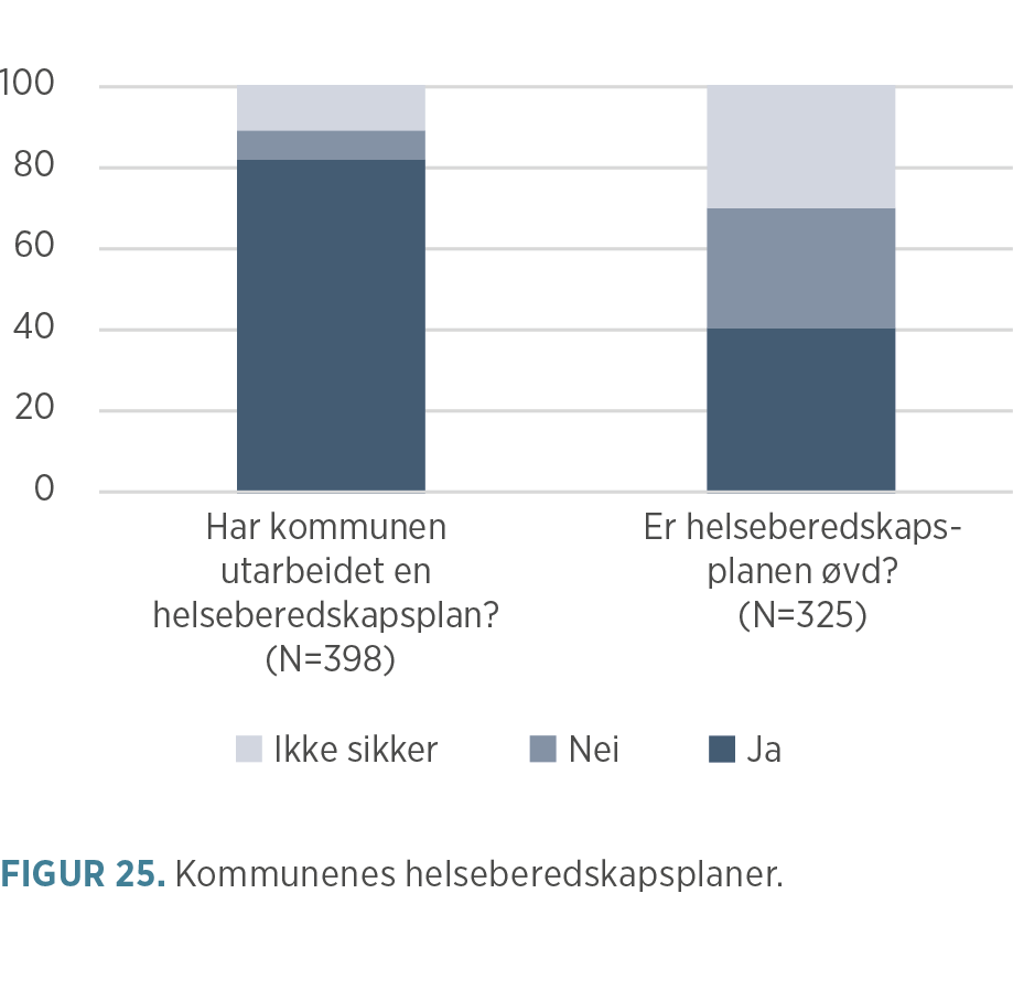 På vegne av Helsedirektoratet har DSB i årets undersøkelse spurt om arbeidet med helseberedskapsplaner i kommunene (figur 25).