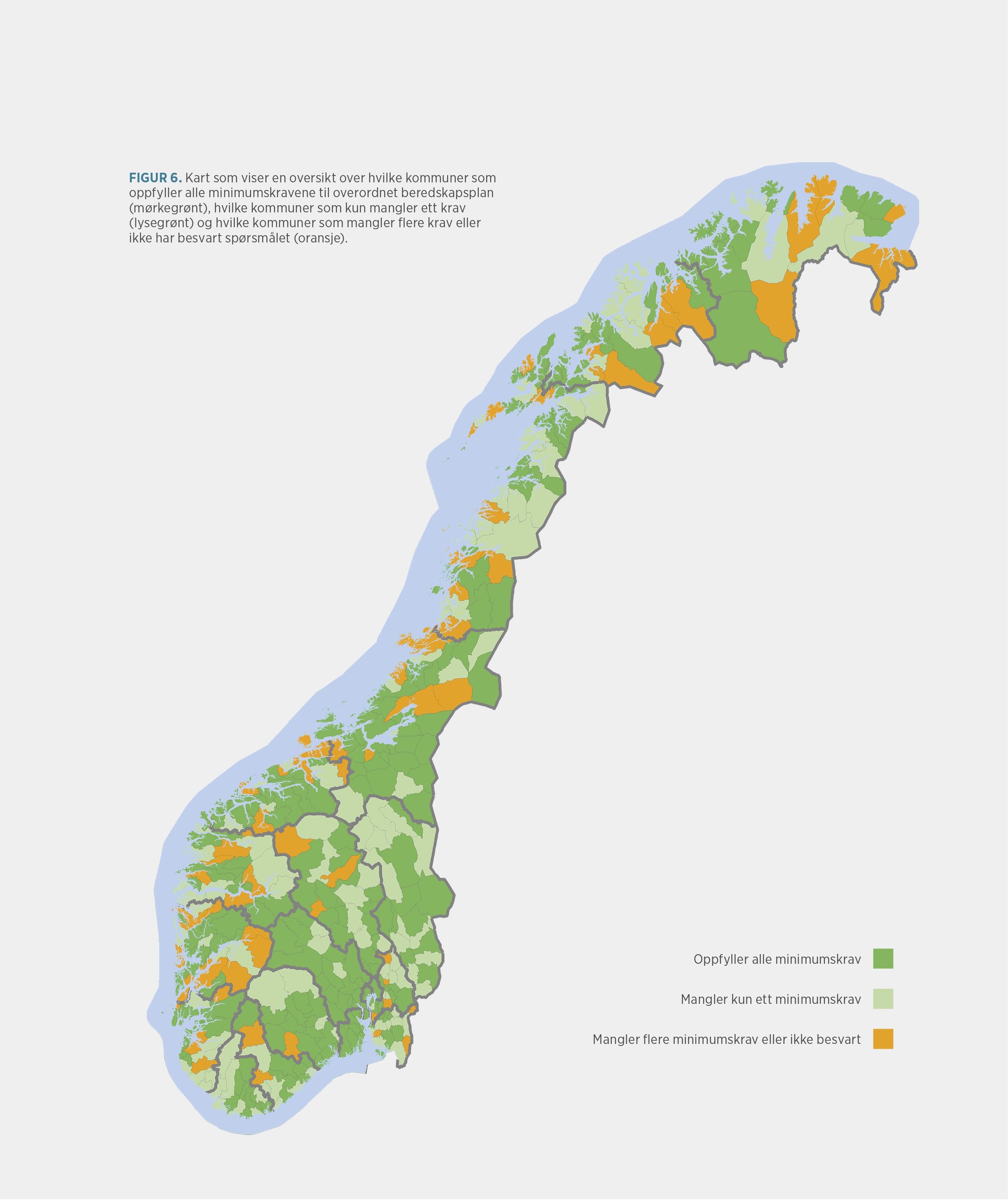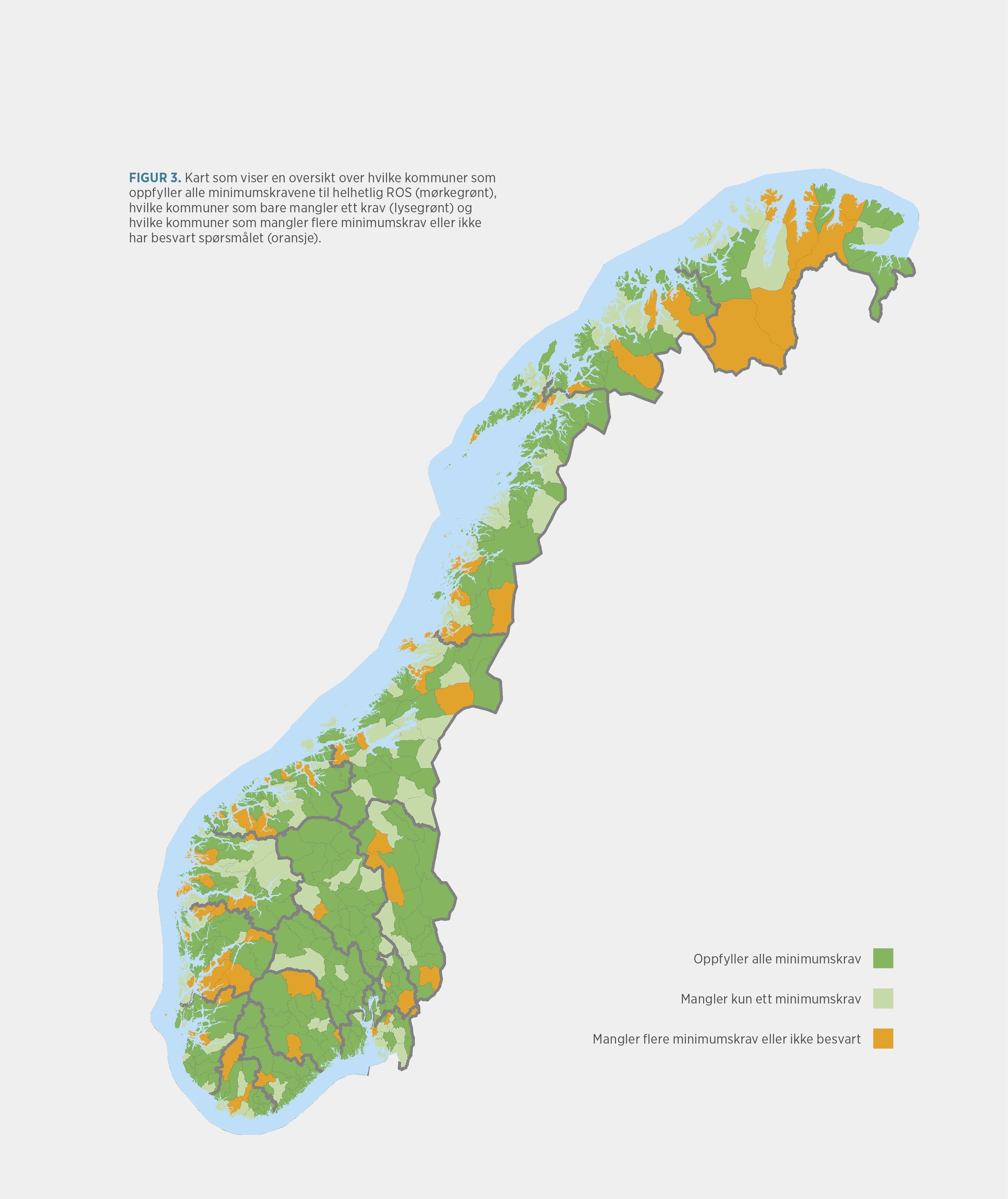 Kartet (figur 3) viser at Vestfold og Telemark, Innlandet, Agder, Oslo og Viken, og Rogaland har den største andelen av kommuner som oppfyller flest minimumskrav til helhetlig ROS. Fra Vestlandet og nordover er det færre kommuner som oppfyller like mange krav. Analyser av tallene viser også at det er en større andel blant de største kommunene (over 20000 innbyggere) enn blant de mindre som oppfyller minimumskravene til helhetlig ROS.