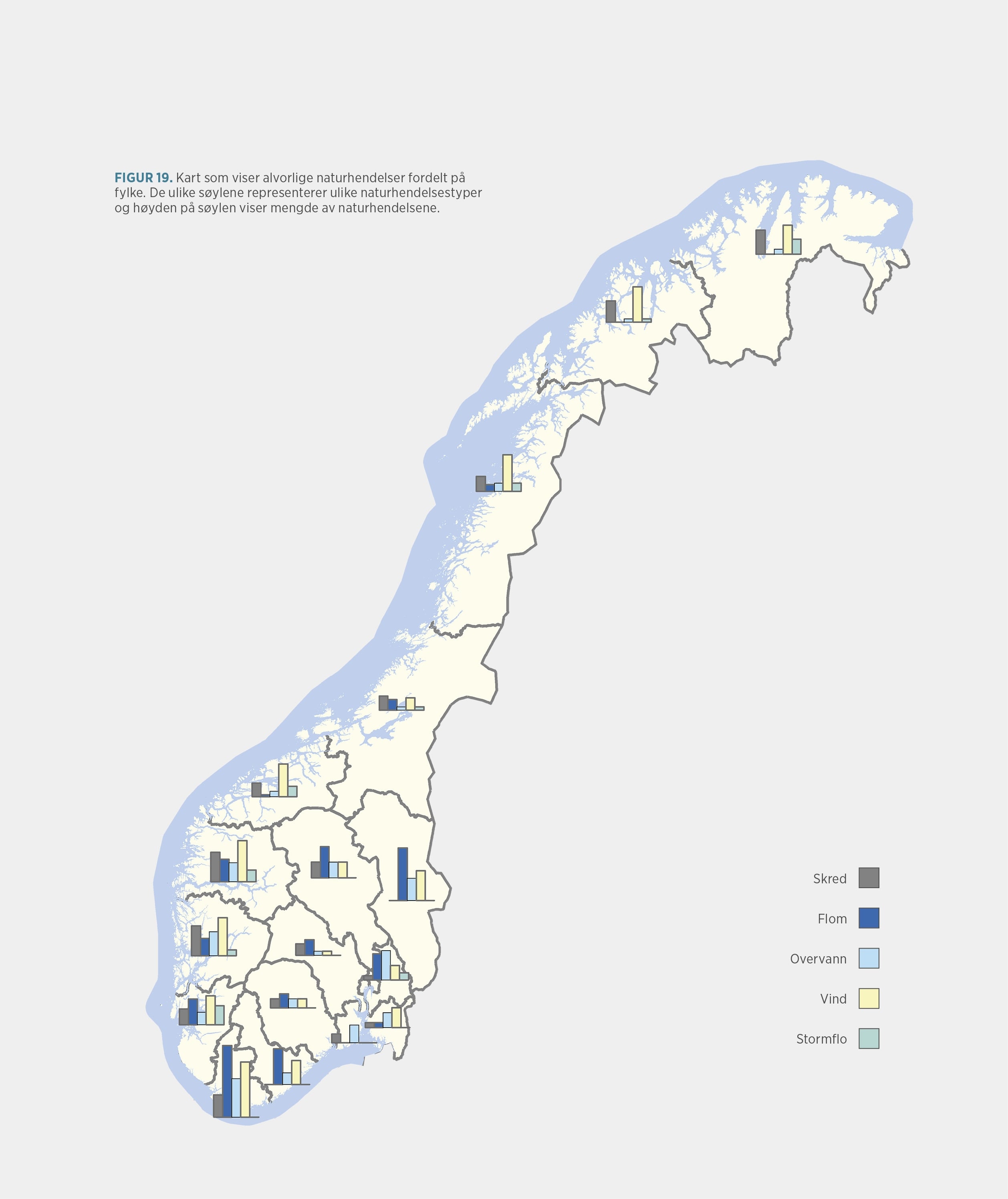 Kartet viser at de fleste fylker har vært utsatt for alvorlige naturhendelser i løpet av de siste to år (figur 19). Agder har opplevd mange alvorlige naturhendelser, og spesielt flom, vind og overvann har gitt store utfordringer for fylket. Flere Agderkommuner har i tillegg hatt alvorlige hendelser med kraftig snøfall. Trøndelag har hatt få hendelser de siste to årene. De fleste kommuner på østlandet har heller ikke opplevd mange hendelser. Unntaket er Hedmark som skårer relativt høyt på antall hendelser med flom. For Nord-Norges del er det flest vind-hendelser som har satt kommunene på prøve.