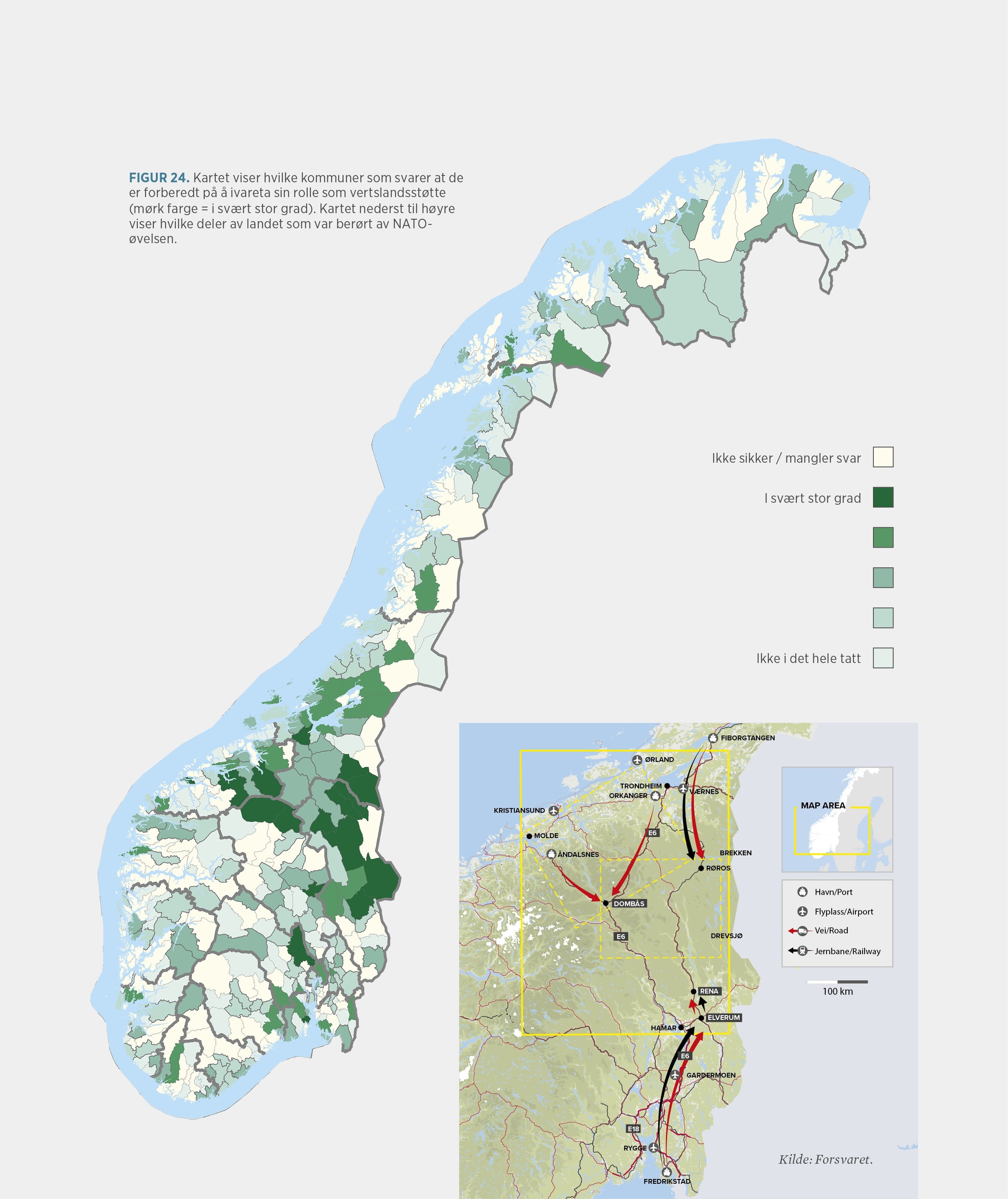 Vertslandsstøtte er definert som sivil og militær assistanse til allierte styrker og andre organisasjoner, som er stasjonert i, som opererer i eller er i transitt gjennom vertsnasjonens territorium, i fred, i kriser og naturkatastrofer eller krig2. Dette er en viktig del av kommunenes rolle i totalforsvaret. Resultatene viser at kommunene i varierende grad er forberedt på denne oppgaven. NATO-øvelsen høsten 2018 ga et utvalg kommuner erfaring med ivaretakelse av slik vertslandsstøtte. En nærmere undersøkelse av resultatene viser at det i hovedsak er de kommunene som deltok i eller var berørt av øvelsen som svarer at de er forberedt på å ivareta slik vertslandsstøtte (figur 24).