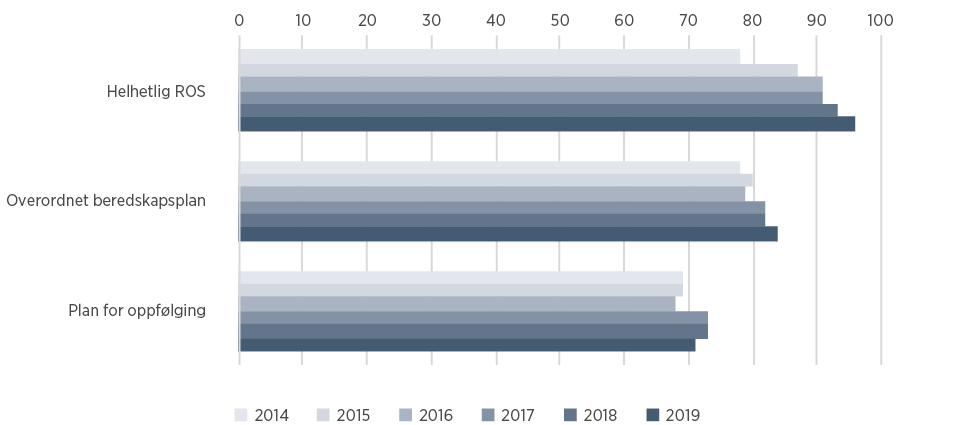 - Hele 98 prosent av kommunene oppgir at de har gjennomført helhetlig ROS. Til sammenligning var tallene henholdsvis 97 og 98 prosent i 2017 og 2018 (figur 2).