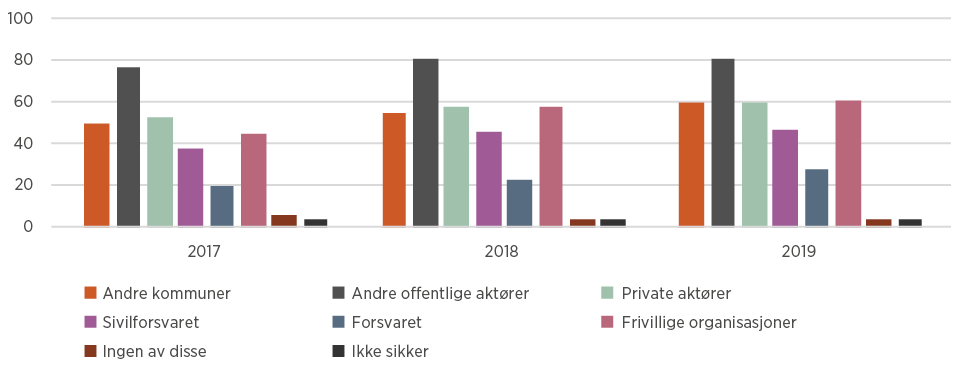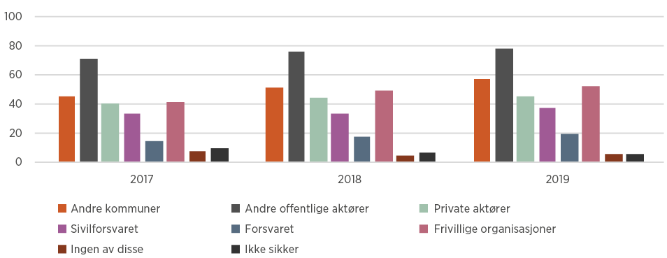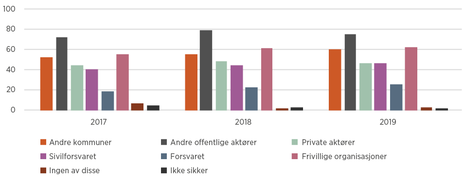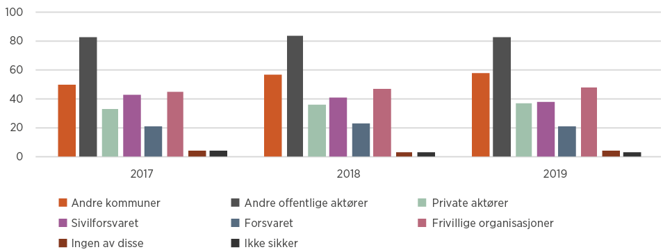 For å kunne håndtere en krise på en god måte, er det nødvendig at deltakere i kommunens kriseorganisasjon er kjent med ansvar, organisering og rollefordeling. Det er opp til kommunen selv hvordan de organiserer sin kriseorganisasjon. Lov om kommunal beredskapsplikt stiller kun krav om en kriseledelse, og at de som inngår i krisehåndteringen har fått opplæring. En kriseledelse vil ha behov for støtte og vi har derfor spurt kommunene hvem de samarbeider med når det gjelder krisehåndtering (figur 16).