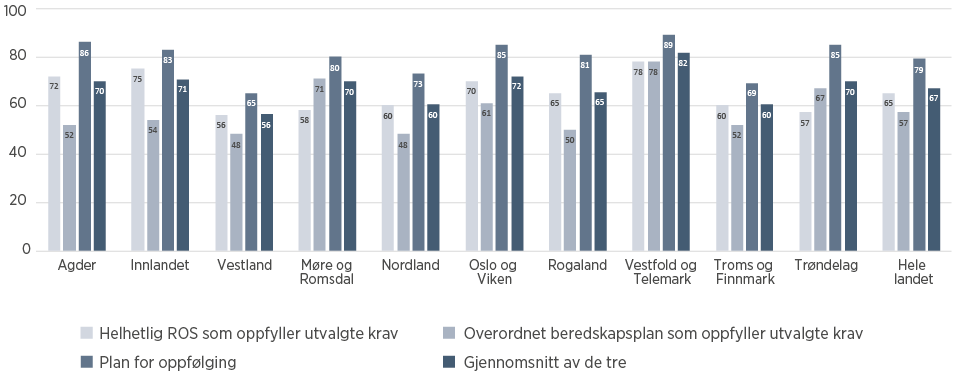 De fylkesvise forskjellene i oppfyllelse av helhetlig ROS-krav og krav til overordnet beredskapsplan er beskrevet i kapittel 2.1.1 og 2.2.1. Når det gjelder plan for oppfølging er det Vestland, Troms og Finnmark og Nordland som ligger under landsgjennomsnittet.