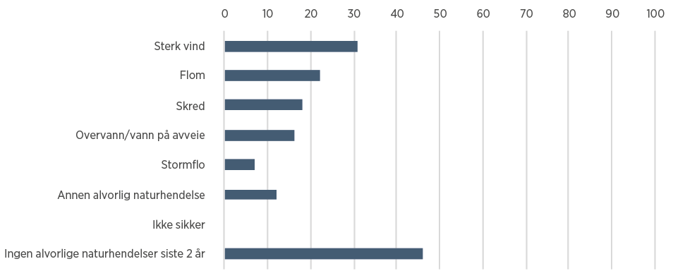 Flere enn halvparten av kommunene sier i årets undersøkelse at de har opplevd en eller flere alvorlige naturhendelser de siste to år. Hendelsene ga svikt og forstyrrelser i kritiske samfunnsfunksjoner, og førte også til skader på infrastruktur og private boliger. I tillegg førte naturhendelsen og følgehendelsene til behov for evakuering.