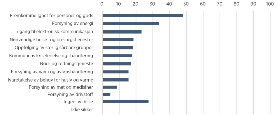 Omtrent 50 prosent svarte at alvorlige naturhendelser førte til svikt i framkommelighet for personer og gods, og 34 prosent av kommunene svarte forstyrrelser i forsyning av energi. Videre ser vi at tilgang på elektronisk kommunikasjon blir påvirket under naturhendelser. Flere nevner også helse- og omsorgstjenester og oppfølging av særlig sårbare grupper som blir berørt.
