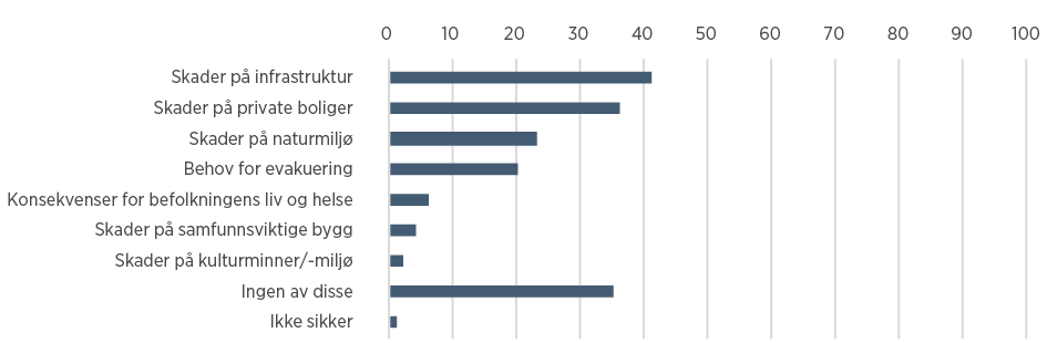 41 prosent av kommunene svarte at naturhendelsen og/eller følgehendelser førte til skader på infrastruktur, 36 prosent svarte at disse førte til skader på private boliger, 23 prosent opplyste at naturhendelser og eller følgehendelser ga skader på naturmiljø, og 20 prosent av kommunene svarte at naturhendelsen og/eller følgehendelser førte til behov for evakuering. Når vi ser nærmere på konsekvensene av de alvorlige naturhendelsene, så ser det ut som at det er flom og sterk vind som fører til flest skader på infrastruktur og private boliger.