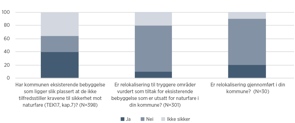 Mye eksisterende bebyggelse er oppført i en tid hvor det ikke var like strenge krav som i dag til sikkerhet mot naturfarer. Ny kunnskap, slik som for eksempel nyere kartlegginger av fare for flom og skred, kan også avdekke fareområder som tidligere ikke var like godt kjent. I slike områder kan det i dag ligge eksisterende bebyggelse. I årets undersøkelse ønsket vi å få mer informasjon om i hvilken grad kommunene har oversikt over bebyggelse som ligger slik plassert at de ikke tilfredsstiller kravene til sikkerhet mot naturfare ihht TEK17, kap.7. Vi ønsket også å vite om de har vurdert eller gjennomført relokalisering av utsatt eksisterende bebyggelse til tryggere områder (figur 22).