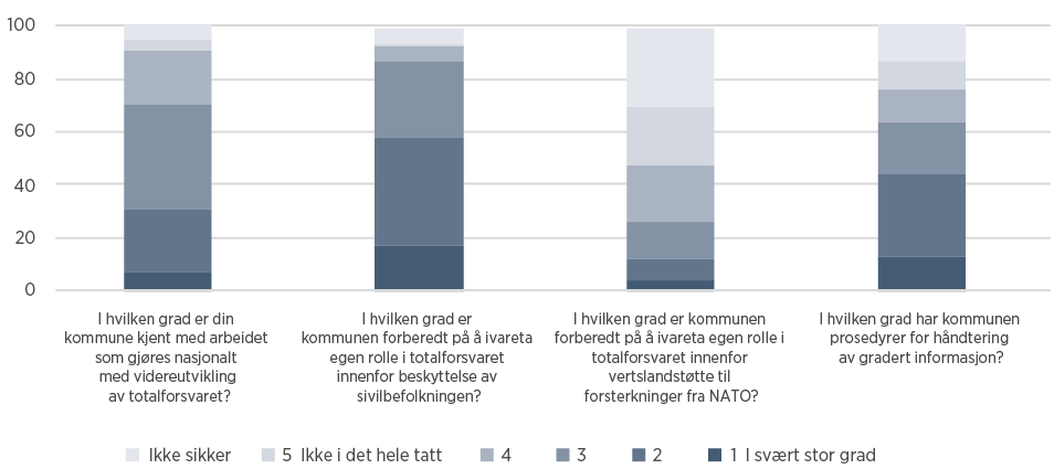 Kommuneundersøkelsen viser at de fleste kommuner er kjent med arbeidet som gjøres nasjonalt med viderutvikling av totalforsvaret (figur 23). Det er imidlertid kun i underkant av en tredjedel av kommunene som svarer at de kjenner til arbeidet i svært stor grad eller i stor grad. Ikke overraskende ser vi at det er kommuner som har samarbeidet med forsvaret, i forbindelse med arbeid med helhetlig ROS, beredskapsplanlegging, øvelser eller krisehåndtering, som i størst grad oppgir kjennskap til totalforsvaret.