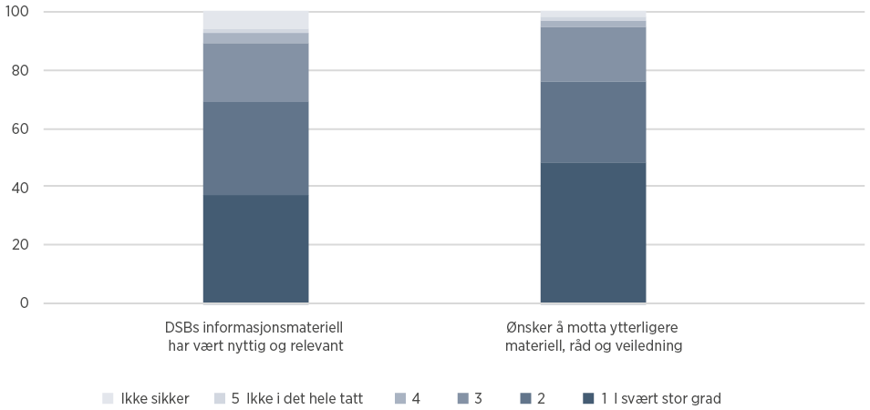 I forbindelse med egenberedskapskampanjen i regi av DSB og Oslo kommune høsten 2018, sendte DSB ut diverse kampanjemateriell til kommunene. Resultatene i kommuneundersøkelsen viser at kommunene synes at kampanjemateriellet DSB gjorde tilgjengelig var nyttig og relevant. Samtidig er majoriteten av kommunene tydelige på at de ønsker enda mer materiell, råd og veiledning fra DSB.