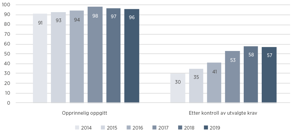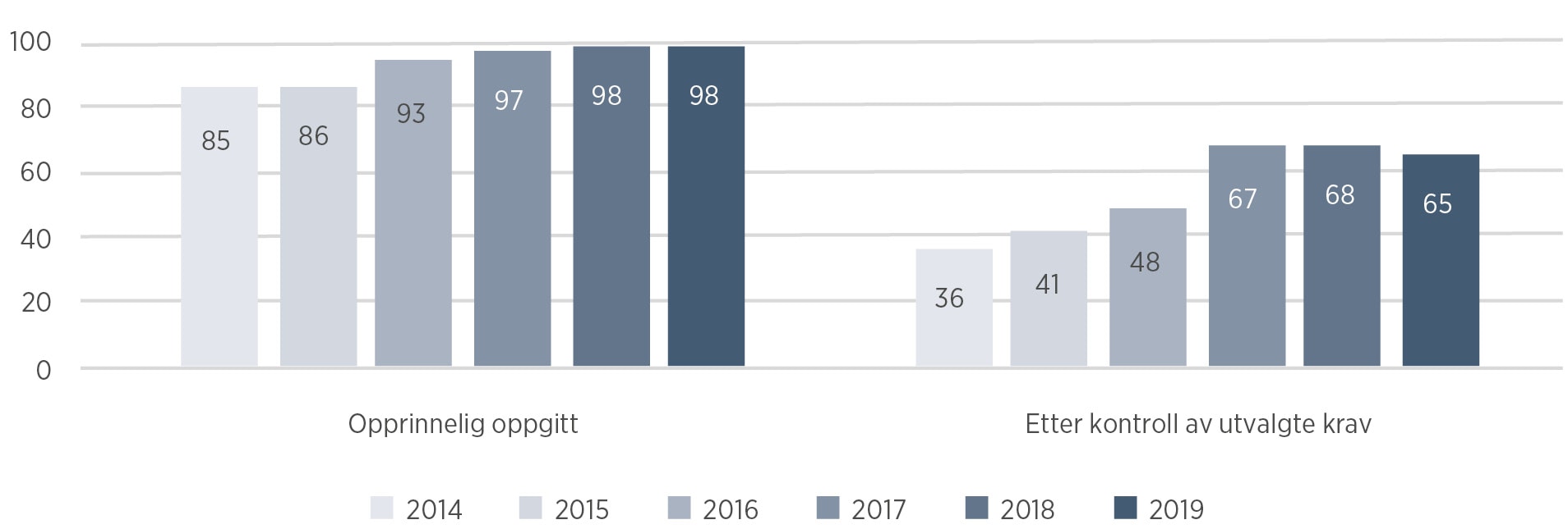 Selv om 98 prosent av kommunene oppgir at de har helhetlig ROS, så får vi et annet bilde når vi knytter svarene opp mot de utvalgte minimumskravene omtalt over. Samlet sett er det 65 prosent av kommunene som har helhetlig ROS som oppfyller alle utvalgte krav (figur 2).
